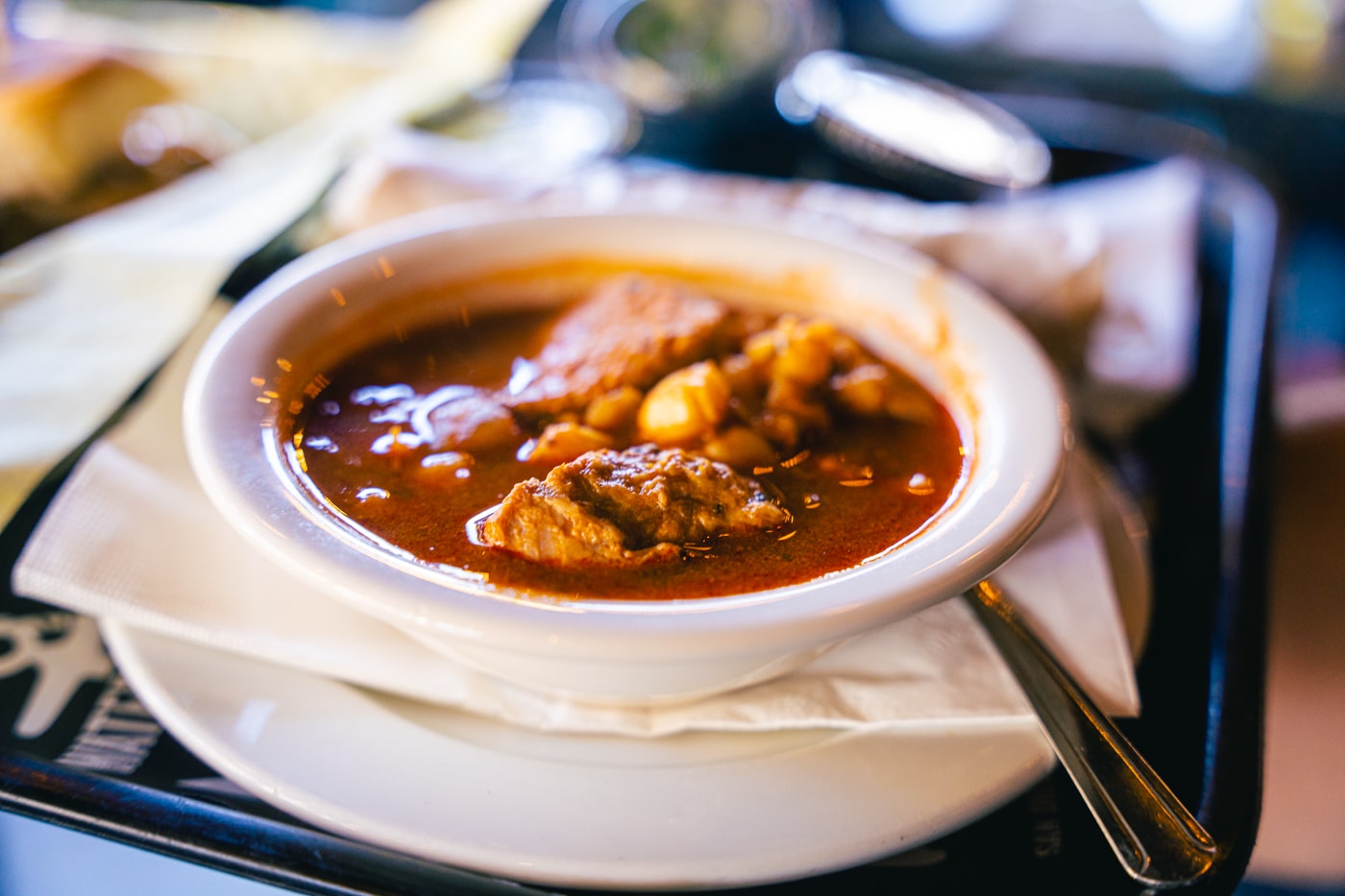 Mexican style soup with chunks of pork and hominy, served with corn tortillas